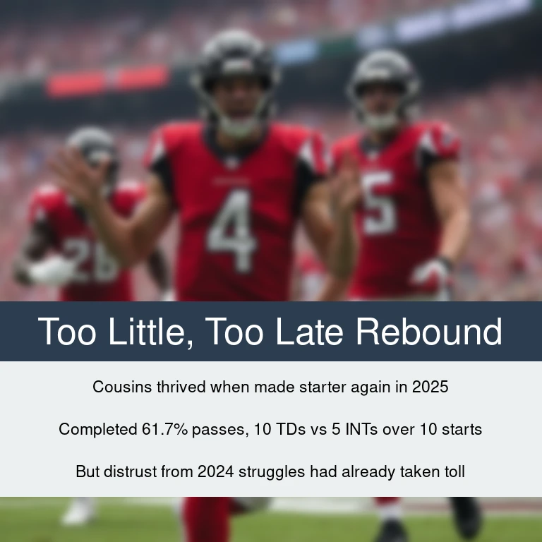 The damage inflicted by draft deception, early-season interceptions, and organizational dysfunction had already eroded the partnership’s foundation. Cousins’ improved performance couldn’t resurrect trust that had fundamentally ruptured, nor alter the organization’s shifting strategic direction.