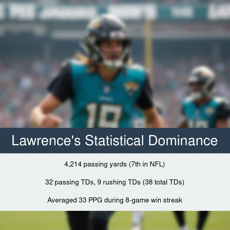 Trevor Lawrence’s dual finalist status sends a powerful message: the Jaguars are no longer a franchise searching for answers. Leading the AFC South with a division title clinched in 2025—their first since 2022 and first under Coen’s leadership—Jacksonville finished as the 3rd seed in the playoffs with a 13-4 record that reflects a fundamental organizational shift. This historic double recognition underscores a franchise turning point: in its 31-year history, Jacksonville has never produced an MVP or Comeback Player of the Year winner, making Lawrence’s nominations a watershed moment. With Lawrence averaging 33 points per game during their winning streak, Jacksonville has become genuinely dangerous. The recognition validates the front office’s patience and the team’s investment in their quarterback, particularly after his triumphant return from injury. Beyond individual statistics, Lawrence has been instrumental in building a winning culture at home. The Jaguars maintain a 10-year road winning streak against AFC South rival Indianapolis dating back to 2014—a streak in which Lawrence’s been central, including a 37-34 shootout victory in 2024. It signals that a perennial rebuild is transforming into a championship contender with competitive resilience, and Lawrence is the symbol of that transformation.